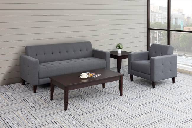 این ست مبل، ترکیبی جذاب از نشیمنهای مبل با روکش خاکستری و میز قهوه اسپرسو و میز عسلی همرنگ را ارائه میدهد.