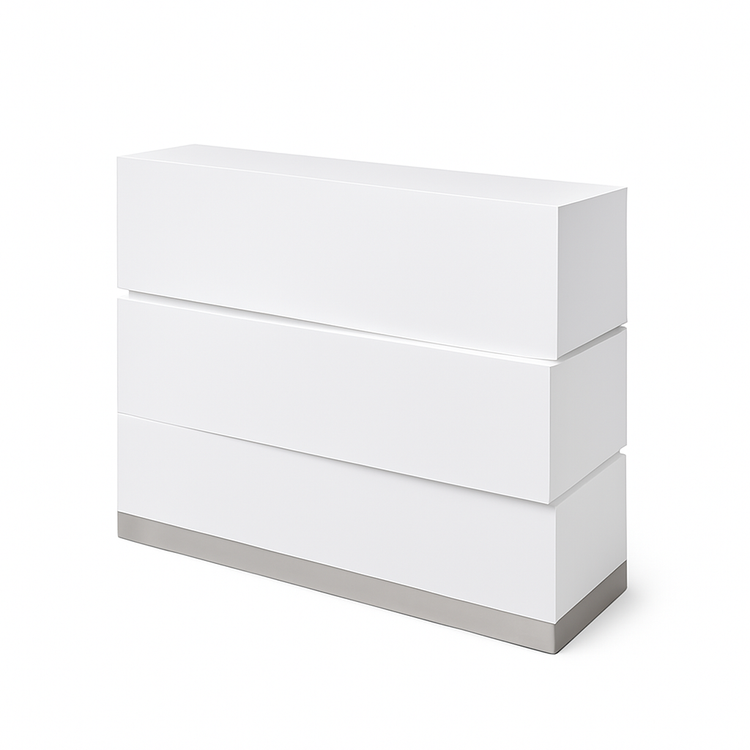 کانتر آتیس با طراحی مکعبی و سطوح تخت، انتخابی فوقالعاده برای فضاهایی است که سادگی و نظم اولویت دارند. این میز با رنگ سفید مات، فرم سهتکه و پایه فلزی نقرهای، جلوهای تمیز و مدرن به فضا میبخشد. ایدهآل برای کلینیکها، دفاتر معماری، نمایشگاهها و برندهایی که طراحی مینیمالیستی را ترجیح میدهند.
