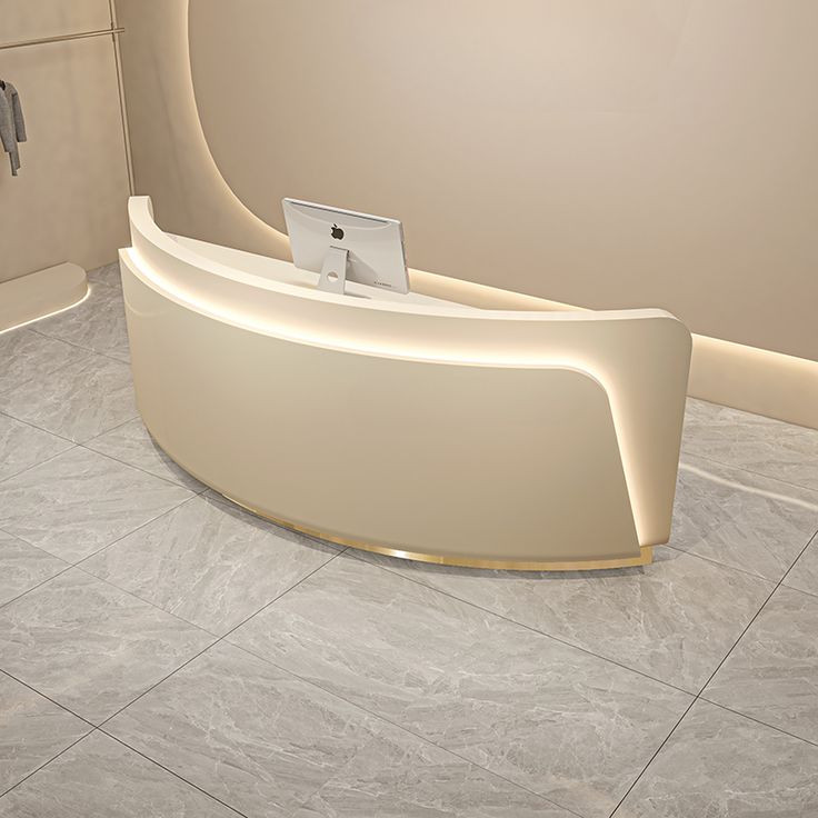 میز پذیرش مدرن با طراحی منحنی و نورپردازی ملایم